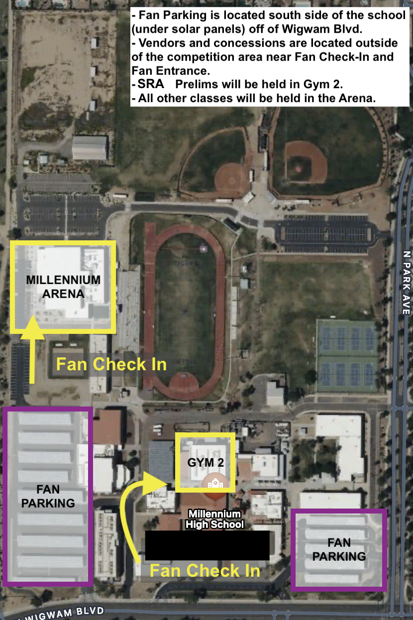 Once fans arrive at the event, they will proceed to Fan Check In (entrance of Millennium arena or Gym two depending on class). Fan Check In will open 30 minutes prior to the first performance and close 30 minutes before the last performance.
